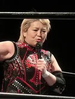 Yumiko Hotta (堀田 祐美子, Hotta Yumiko; born January 10, 1967)[1][3] is a Japanese professional wrestler and mixed martial artist. Hotta was trained by and started her career in the All Japan Women's Pro-Wrestling (AJW) promotion in June 1985. She worked for the promotion until 2003, becoming a three-time WWWA World Single and WWWA World Tag Team Champion. In June 2003, Hotta took over the Hyper Visual Fighting Arsion promotion and renamed it Major Girl's Fighting AtoZ. Under Hotta's leadership, the promotion lasted only three years, before folding in 2006, after which Hotta became a freelancer. In January 2011, Hotta joined the new Universal Woman's Pro Wrestling Reina promotion, but just sixteen months later she announced that the promotion was folding. Afterwards, she affiliated herself with the World Woman Pro-Wrestling Diana promotion, becoming the leader of the villainous Bousou-gun stable. She resigned from Diana in July 2016 to once again become a freelancer. Since 1995, Hotta has also fought several mixed martial arts matches, mostly at events put together by joshi puroresu promotions.