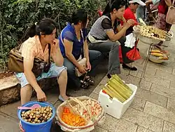 Street vendors. From bottom left: quail eggs, two types of vinegar-preserved vegetables (probably radish), bamboo rice (竹饭 zhufan), barbequed Jianshui tofu, roasted corn.