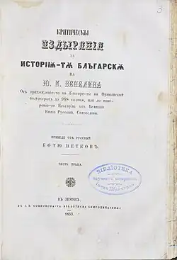 Venelin's book Critical studies on the history of Bulgaria, published posthumously in an abridged version in 1849 in Moscow on historian Spiridon Palauzov's initiative. The issue was financed by Russia-based Bulgarian merchant Ivan Denkoglu. The book was published again in 1853 in a complete Bulgarian translation in Zemun in today's Serbia; the translation was done by teacher Botyu Petkov, father of poet Hristo Botev.
