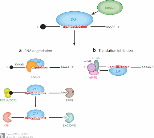 Multiple ZAP cofactors have been reported to be required for antiviral activity. However the E3 ubiquitin ligase TRIM25 (tripartite motif protein 25) and KHNYN (KH-like and NYN domain-containing protein) have the most well documented evidence.[14][15][16] TRIM25 has been shown to promote ZAP activity by multimerization through its RING domain whereas KHNYN acts an active nuclease for RNA cleavage which can be partially replaced functionally by its homolog N4BP1.[17]