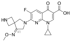 • Fc1c(nc2c(c1)C(=O)C(\C(=O)O)=C/N2C3CC3)N5C\C(=N\OC)C4(CNC4)C5