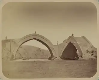 Zarafshan Water Bridge is located 7–8 km northeast of Samarkand on the left bank of the Zarafshan River.[1][2] Currently, it is situated slightly below the railway bridge in the form of a massive brick arch, which is one of the spans of this bridge. In historical sources, the bridge is mentioned under various names such as "Timur's Arch," "Puli Shadman Malik," and "Abdullah Khan's Bridge".[1][2][3]