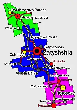 Until 18 July 2020, Zatyshshia belonged to Zakharivka Raion. The raion was abolished in July 2020 as part of the administrative reform of Ukraine, which reduced the number of raions of Odesa Oblast to seven. The area of Zakharivka Raion was merged into Rozdilna Raion.[3][4]