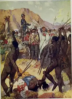 In 1684, Changamire Dombo, ruler of the emerging Rozvi kingdom, achieved a victory over the Portuguese at Maungwe. The Portuguese were backed with musketeers and thousands of African auxiliaries, but Dombo's archers held their ground and defeated the Portuguese, seizing their firearms and trade goods. He then moved south, conquering Naletale and Danangombe, the latter becoming the capital of the Rozvi kingdom.[5]