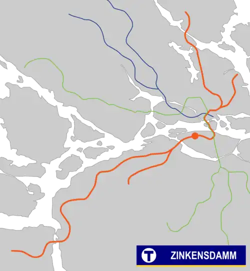 Zinkensdamm is a Stockholm metro station in Södermalm, Stockholm, Sweden. The station was opened on 5 April 1964 as part of the first stretch of the Red line, between T-Centralen and Fruängen.[2][3] The surrounding area is known for the Zinkensdamms IP sports grounds, the Tantolunden Park, the Drakenberg area, and the STF Zinken hostel.