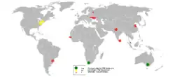 Zirconium has a concentration of about 130 mg/kg within the Earth's crust and about 0.026 μg/L in sea water. It is the 18th most abundant element in the crust.[18] It is not found in nature as a native metal, reflecting its intrinsic instability with respect to water. The principal commercial source of zirconium is zircon (ZrSiO4), a silicate mineral,[12] which is found primarily in Australia, Brazil, India, Russia, South Africa and the United States, as well as in smaller deposits around the world.[19] As of 2013, two-thirds of zircon mining occurs in Australia and South Africa.[20] Zircon resources exceed 60 million tonnes worldwide[21] and annual worldwide zirconium production is approximately 900,000 tonnes.[18] Zirconium also occurs in more than 140 other minerals, including the commercially useful ores baddeleyite and eudialyte.[22]