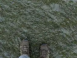 Japanese eelgrass is a small species and usually grows on the upper edge of seagrass beds, typically on mudflats exposed at low tide. The plants lose many of their leaves in the winter.[1] In Hong Kong, algae grows on the blades of this seagrass and snails in the species Clithon graze on this epiphytic growth. In a research study, where the snails were excluded from certain areas of seagrass bed, the epiphytic load increased and this had a deleterious effect on the total biomass of the seagrass, reducing the amount of photosynthesis and increasing physical damage from waves and currents. In the presence of the snails, the grass blades were kept cleaner, were less likely to break off and their total biomass was increased.[9]
